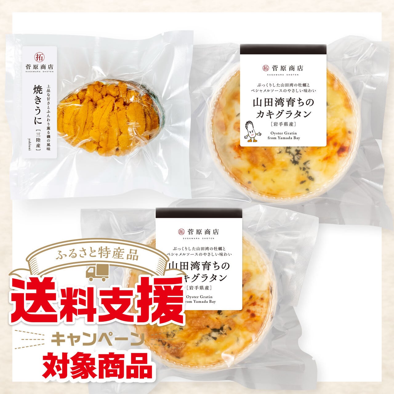 岩手県産 塩うに1個と、山田湾育ちのかきグラタンが2個入ったセットです。